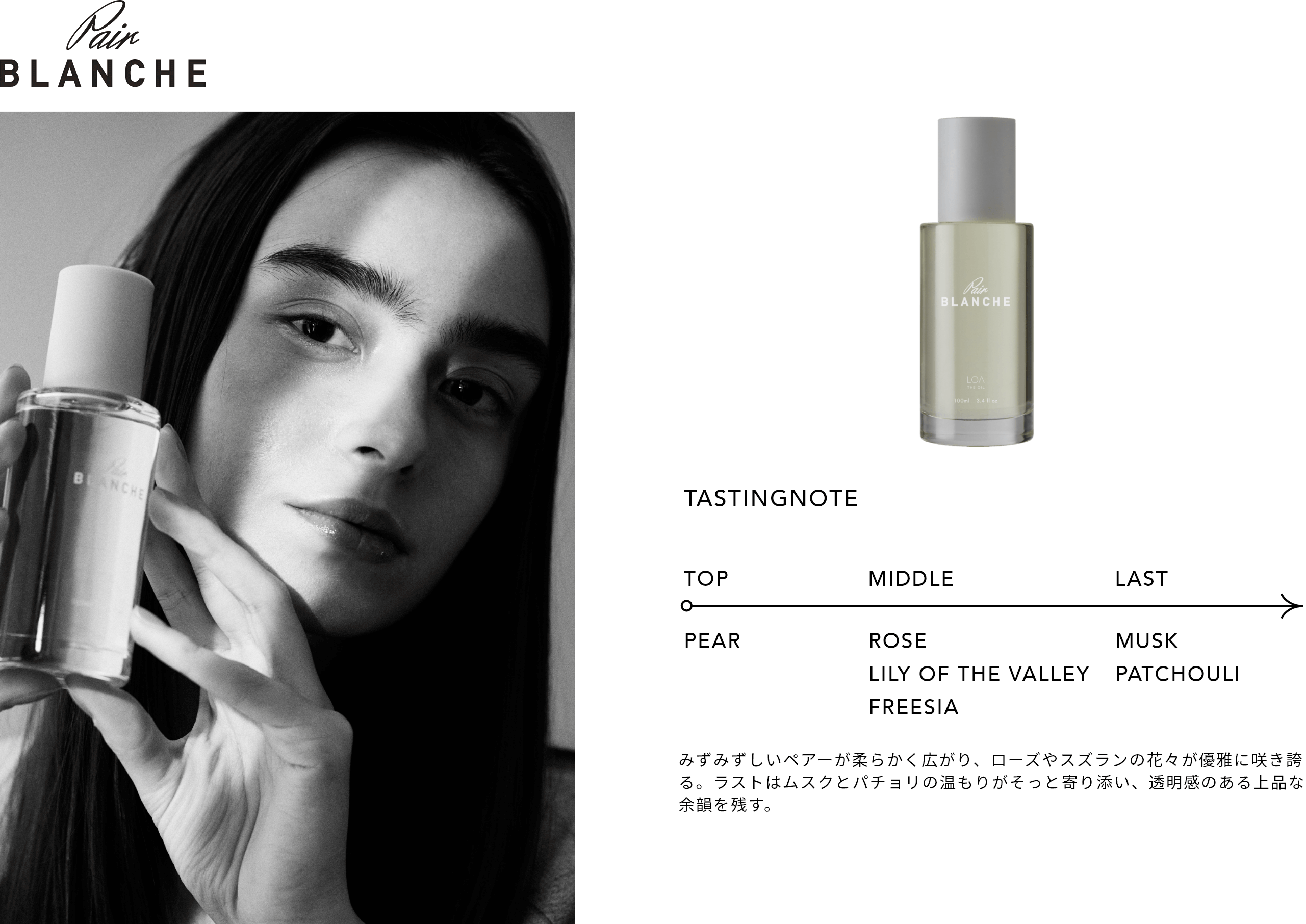 みずみずしいペアーが柔らかく広がり、ローズやスズランの花々が優雅に咲き誇る。ラストはムスクとパチョリの温もりがそっと寄り添い、透明感のある上品な余韻を残す。